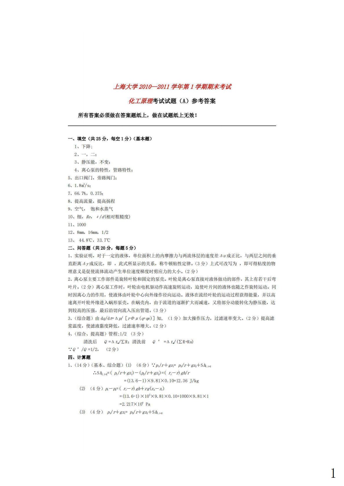 上海大学852化工原理2010-2011学年第1学期期末考试A卷答案