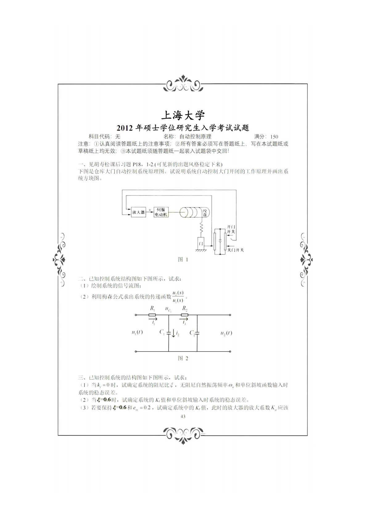 上海大学836自动控制理论(含经典和现代)(学硕)2012年真题
