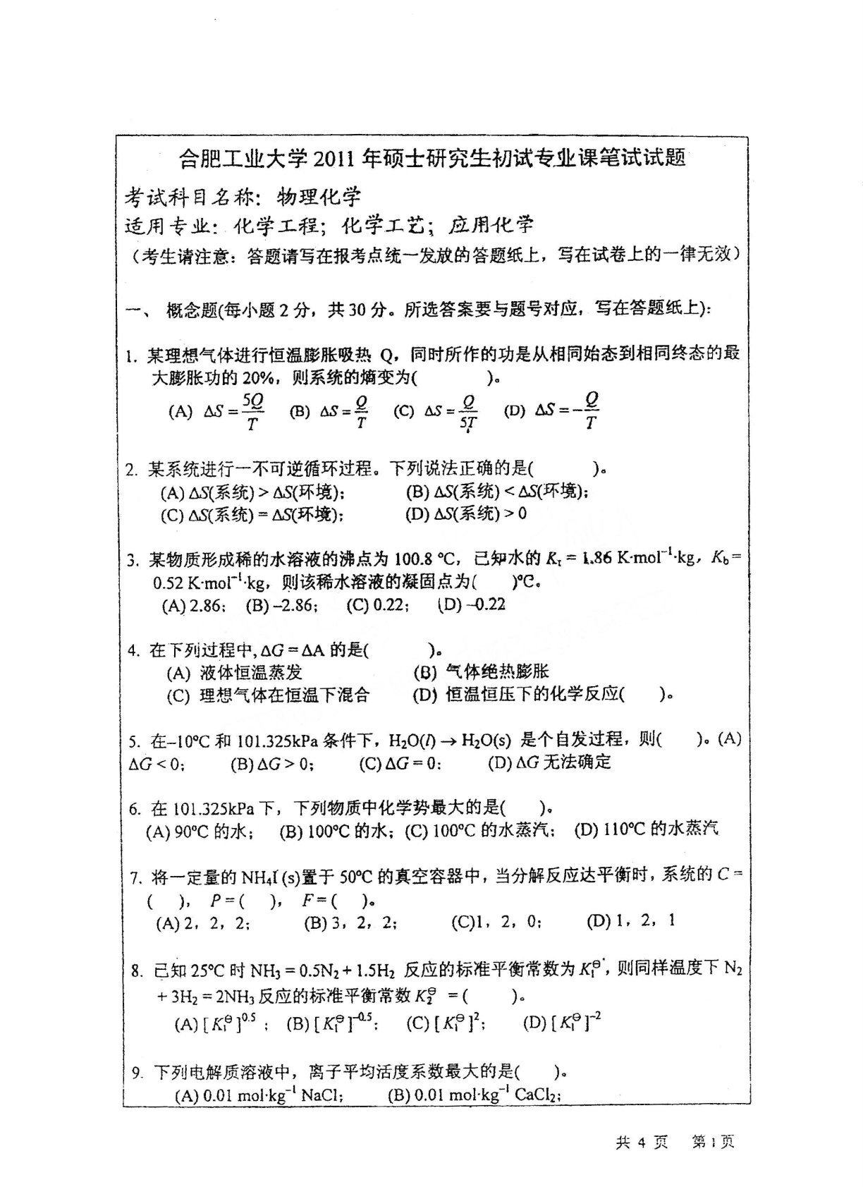 合肥工业大学839物理化学2011年考研真题