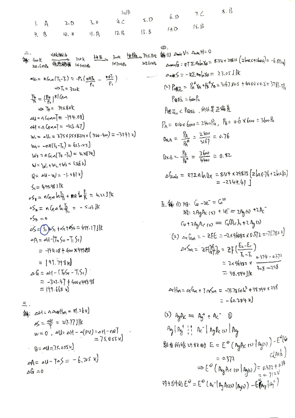 合肥工业大学839物理化学2014年考研真题答案手写版