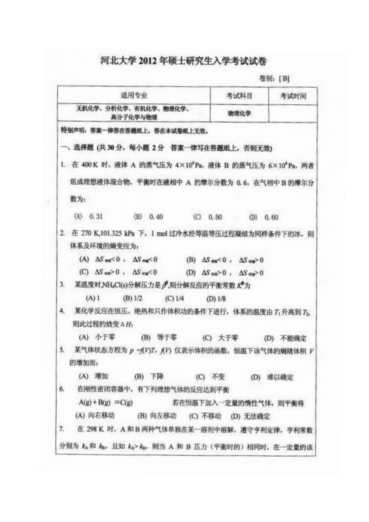 河北大学626物理化学2012年考研真题