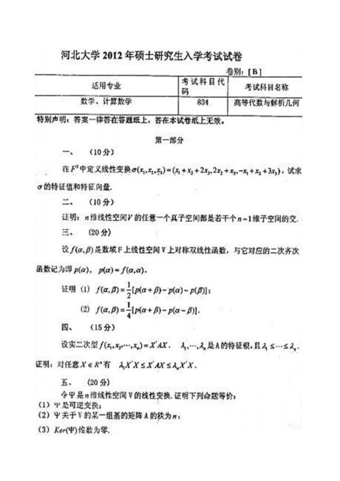 河北大学834高等代数与解析几何2012年考研真题