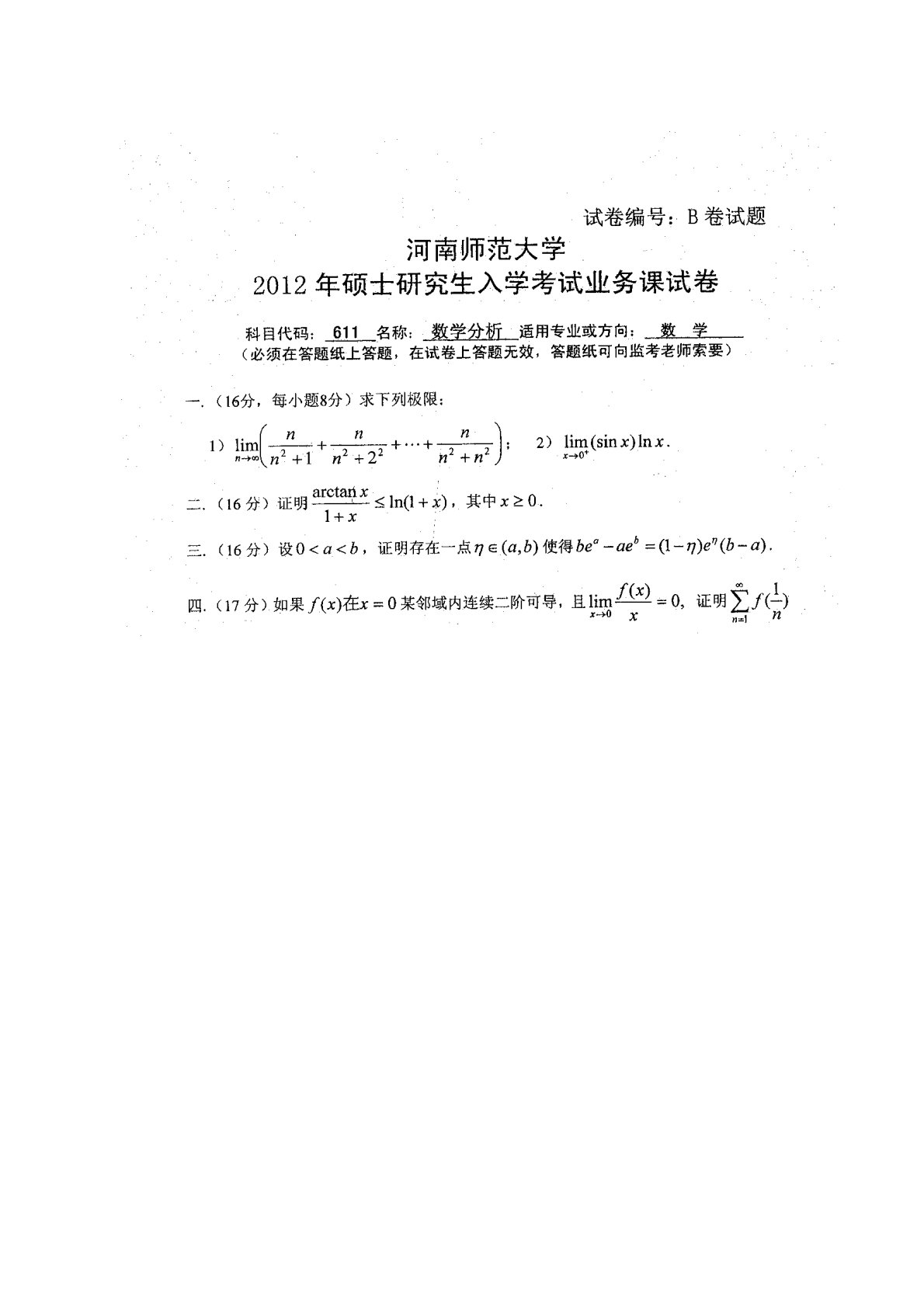 河南师范大学611数学分析2012年真题