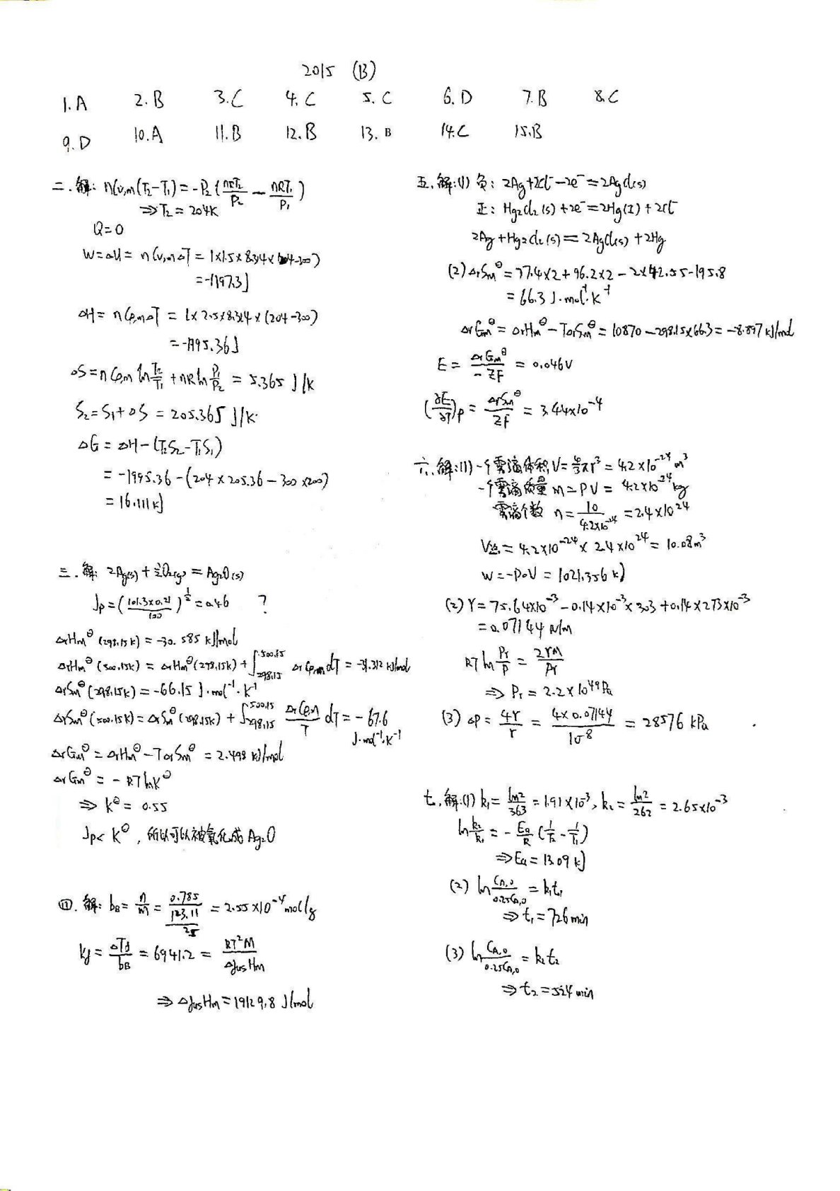 合肥工业大学839物理化学2015年考研真题答案手写版