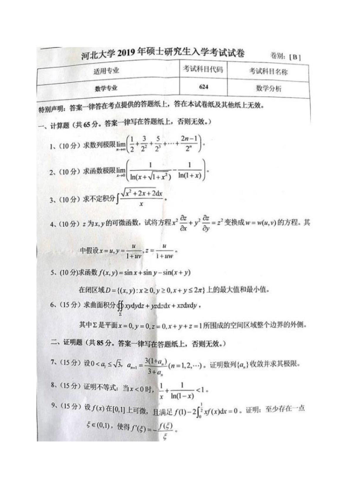 河北大学624数学分析2019年考研真题