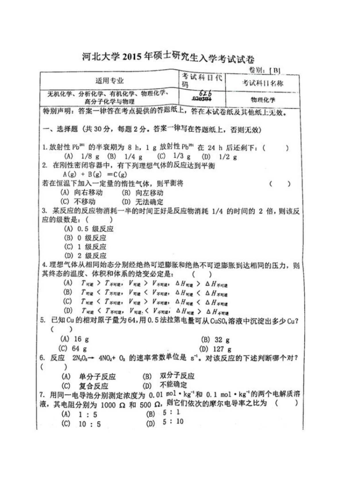 河北大学626物理化学2015年考研真题