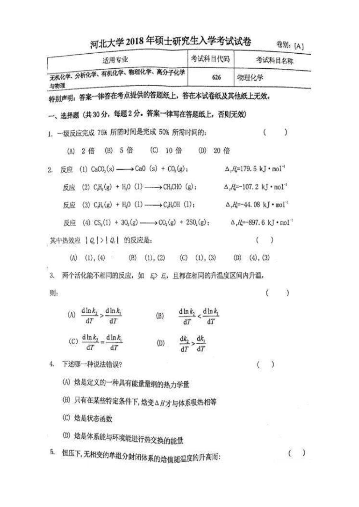 河北大学626物理化学2018年考研真题