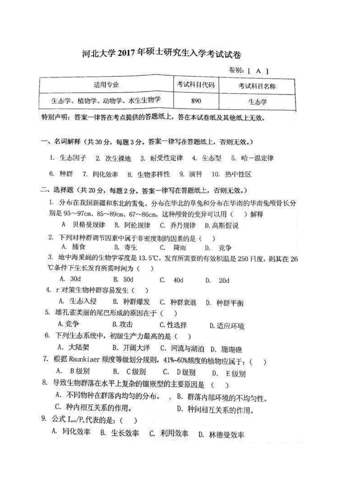 河北大学628生态学2017年考研真题