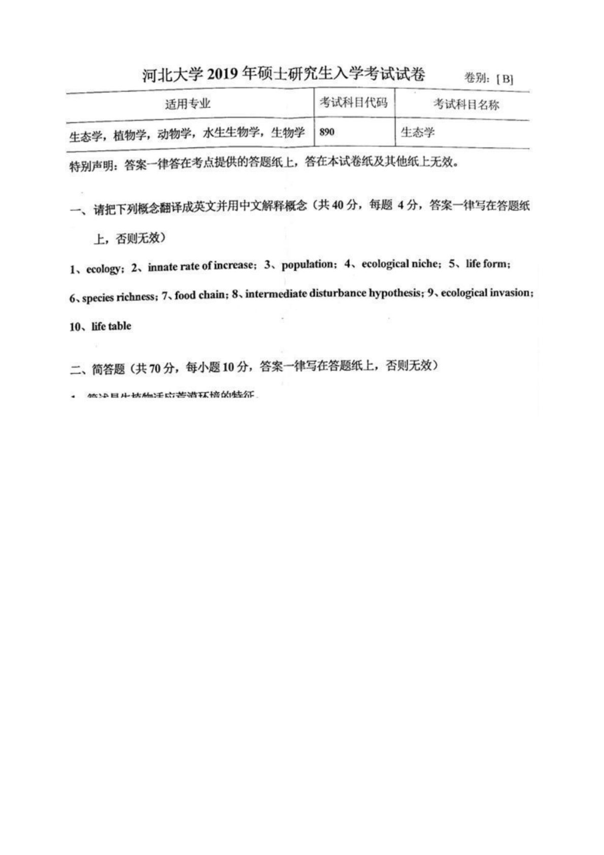 河北大学628生态学2019年考研真题