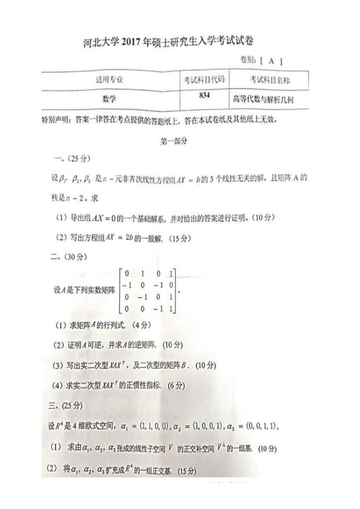 河北大学834高等代数与解析几何2017年考研真题