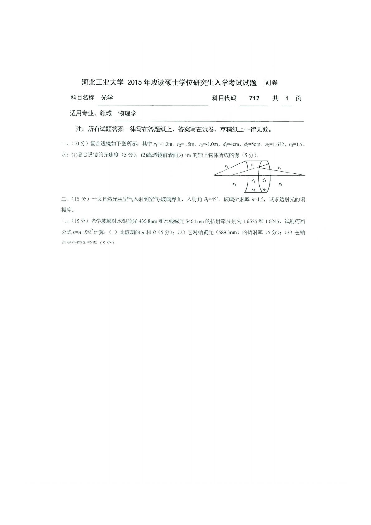 河北工业大学611光学2015年真题
