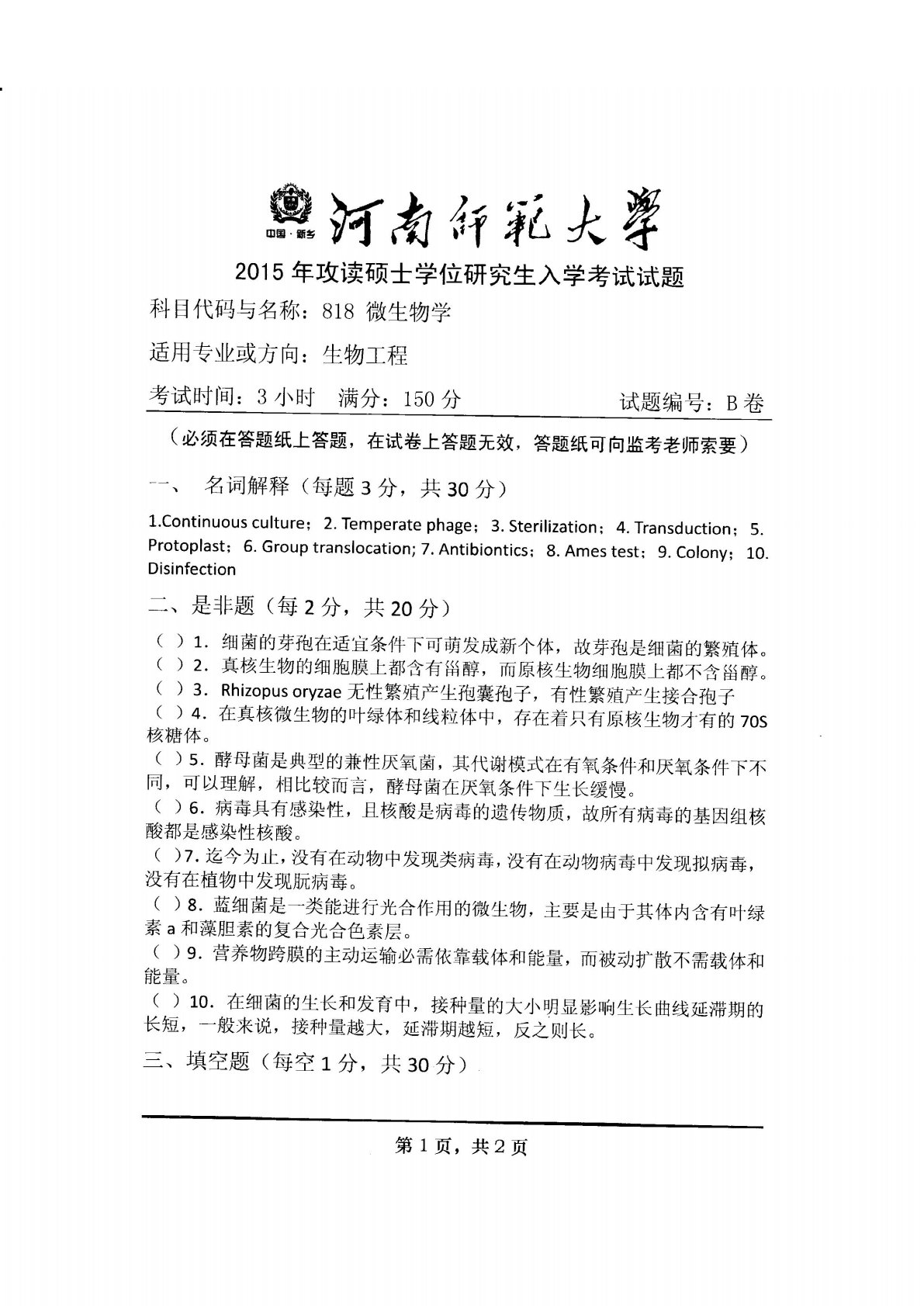 河南师范大学0408微生物学2015年真题