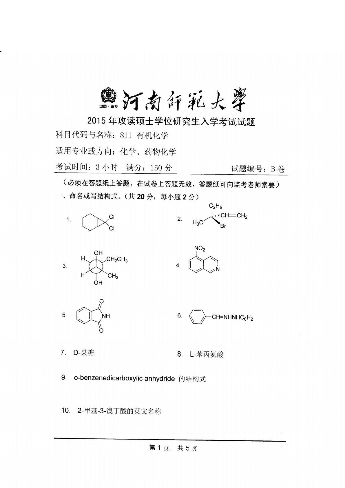 河南师范大学623有机化学2015年真题