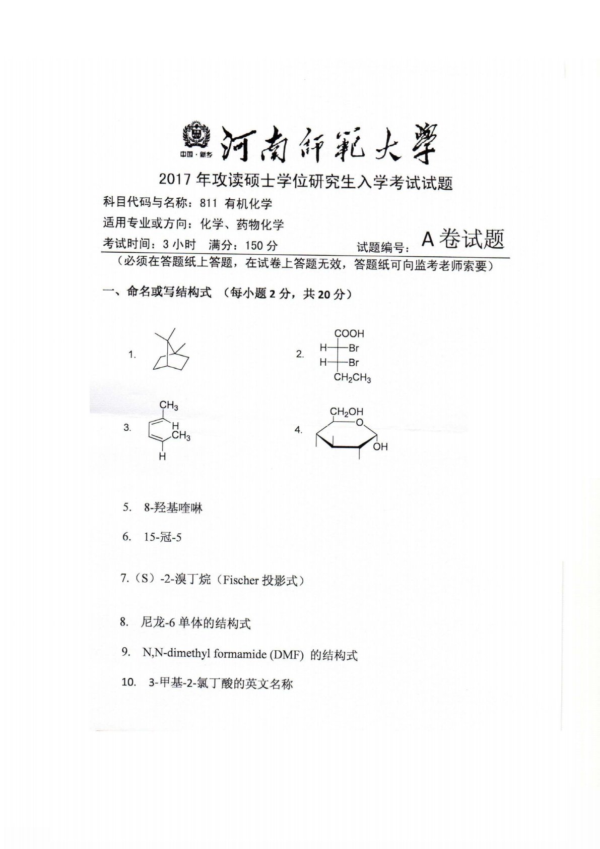 河南师范大学623有机化学2017年真题