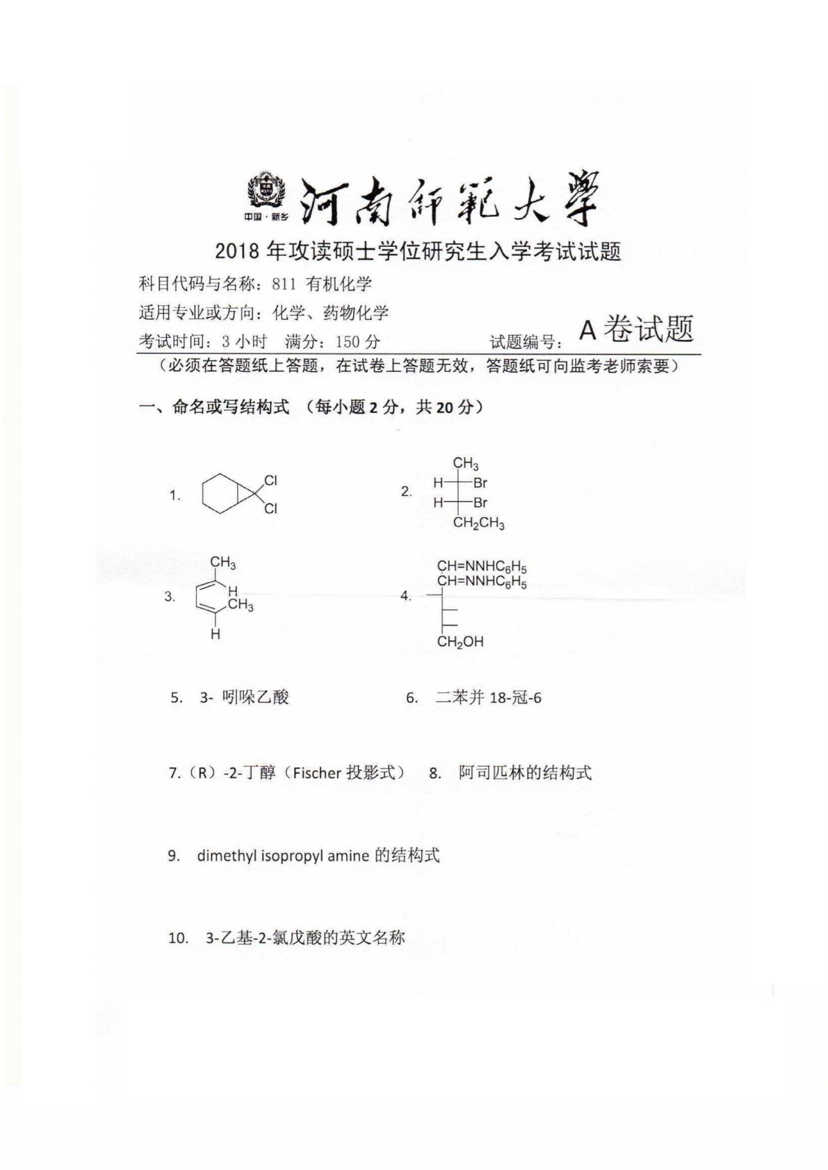 河南师范大学623有机化学2018年真题
