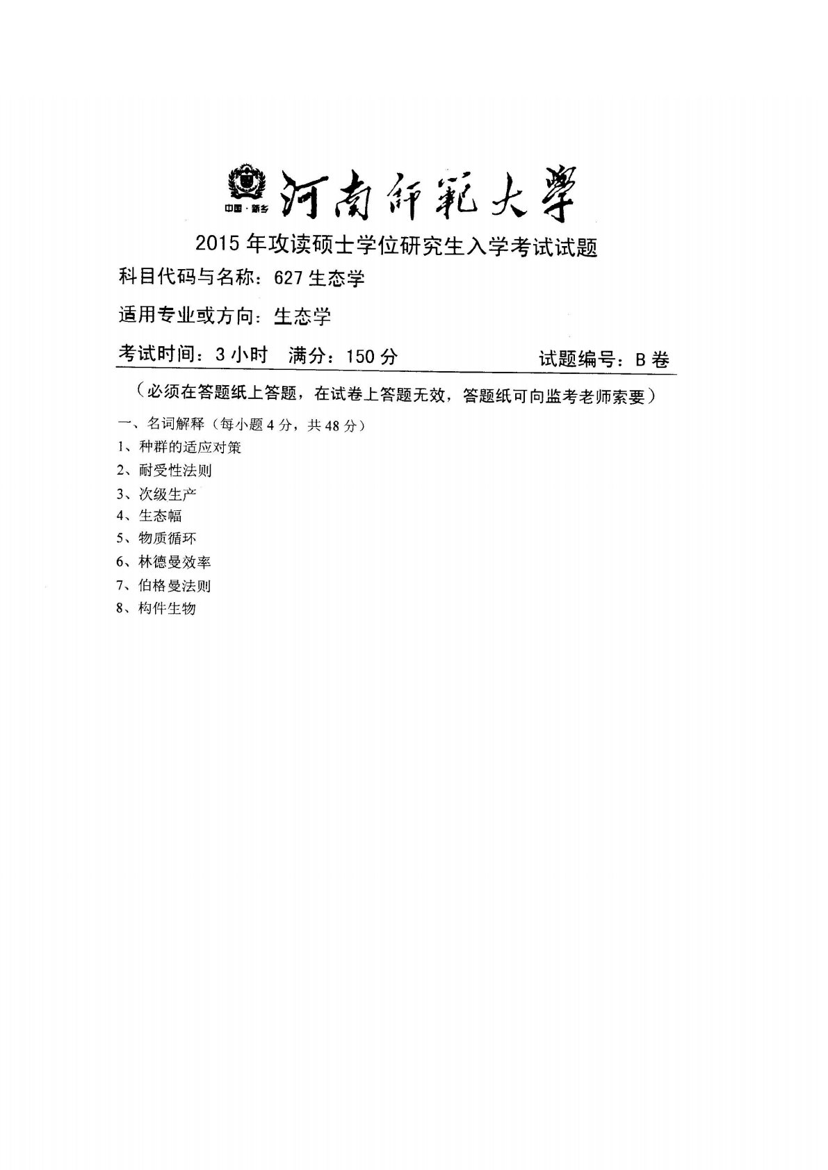 河南师范大学627生态学2015年真题