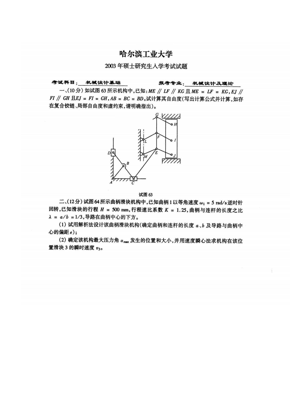 哈尔滨工业大学2003年839机械设计基础考研真题