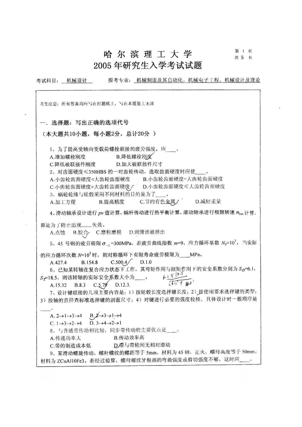 哈尔滨理工大学801机械设计2005年真题