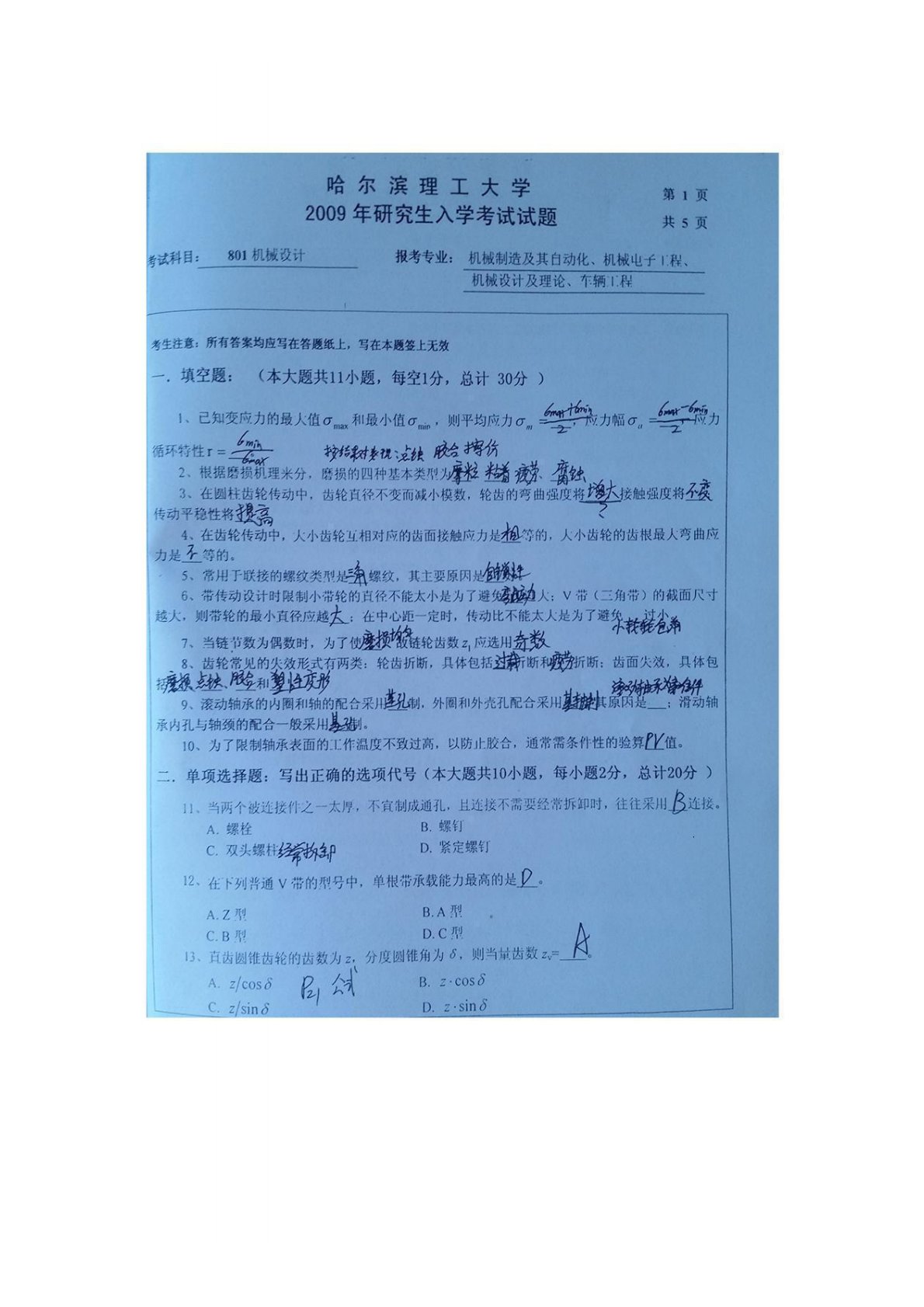 哈尔滨理工大学801机械设计2009年真题