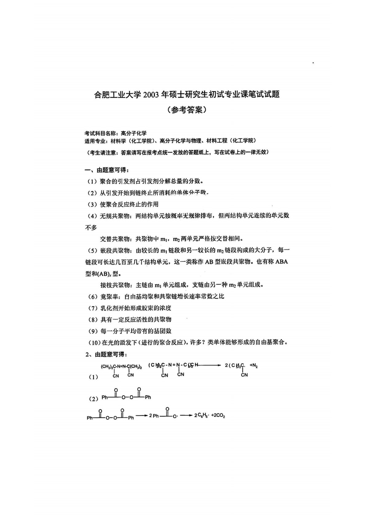 合肥工业大学809高分子化学2003年真题答案
