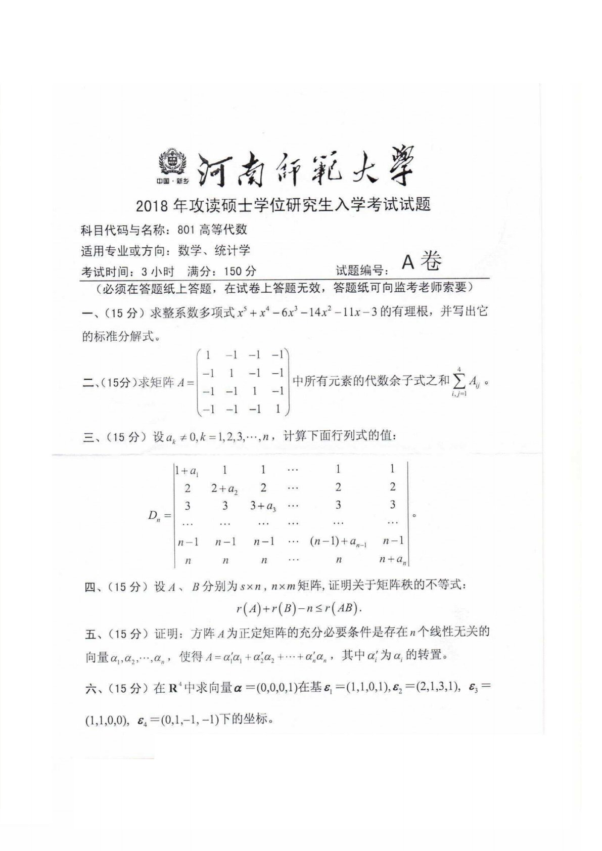 河南师范大学801高等代数2018年真题