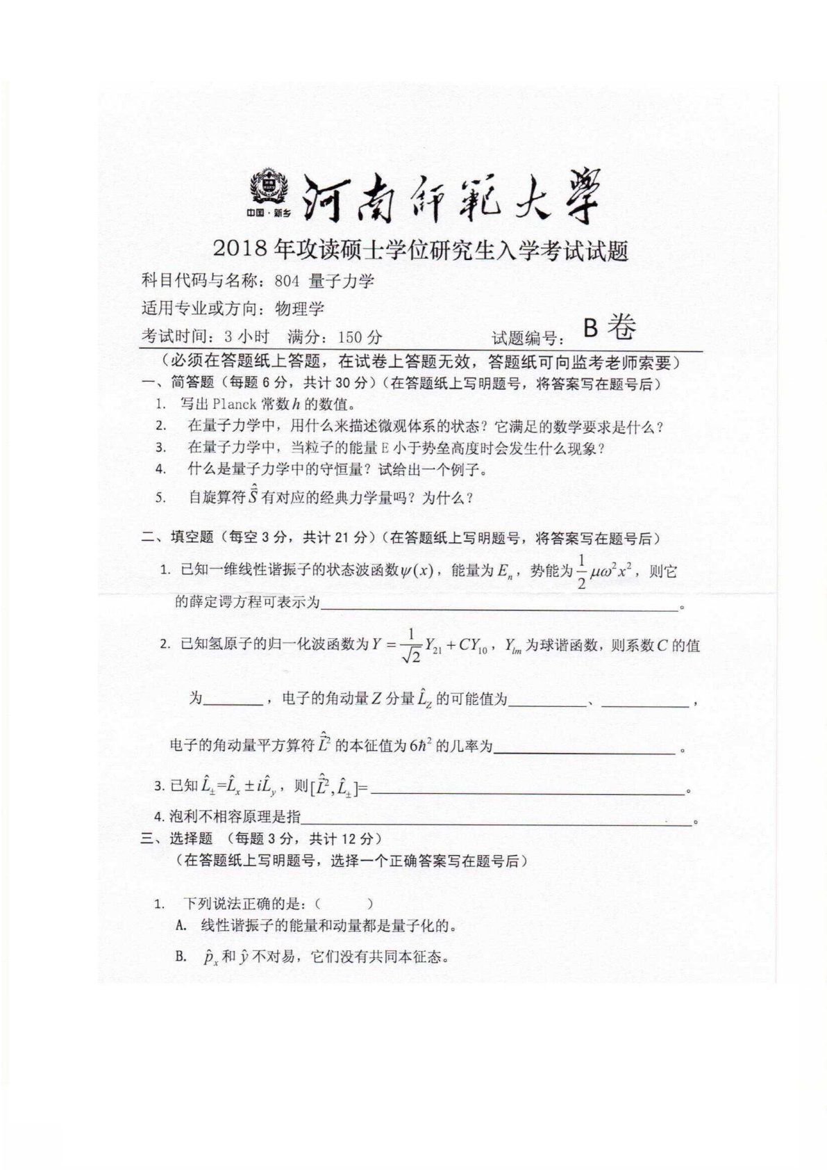 河南师范大学804量子力学2018年真题