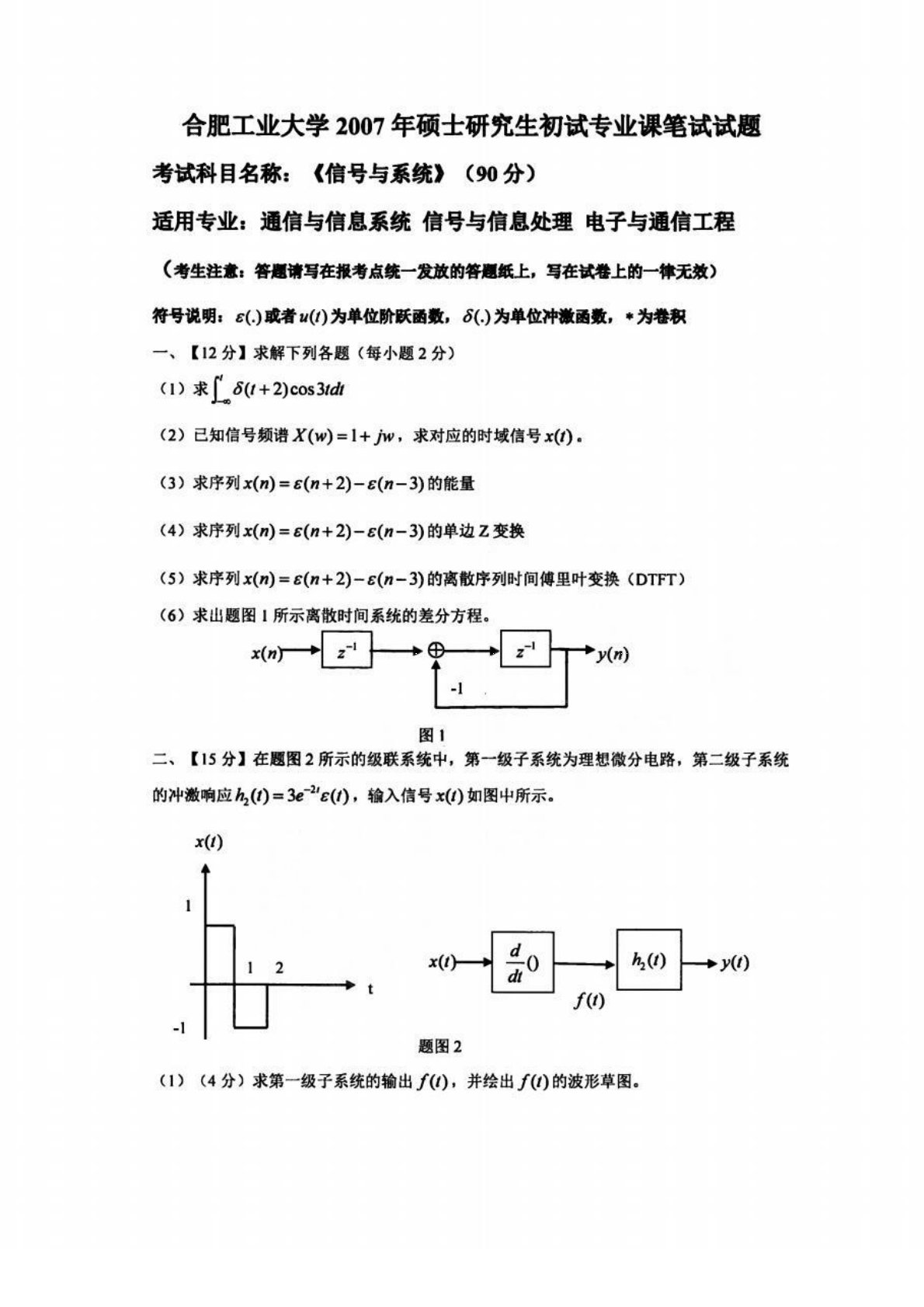 合肥工业大学833信号分析与处理综合2007年考研真题