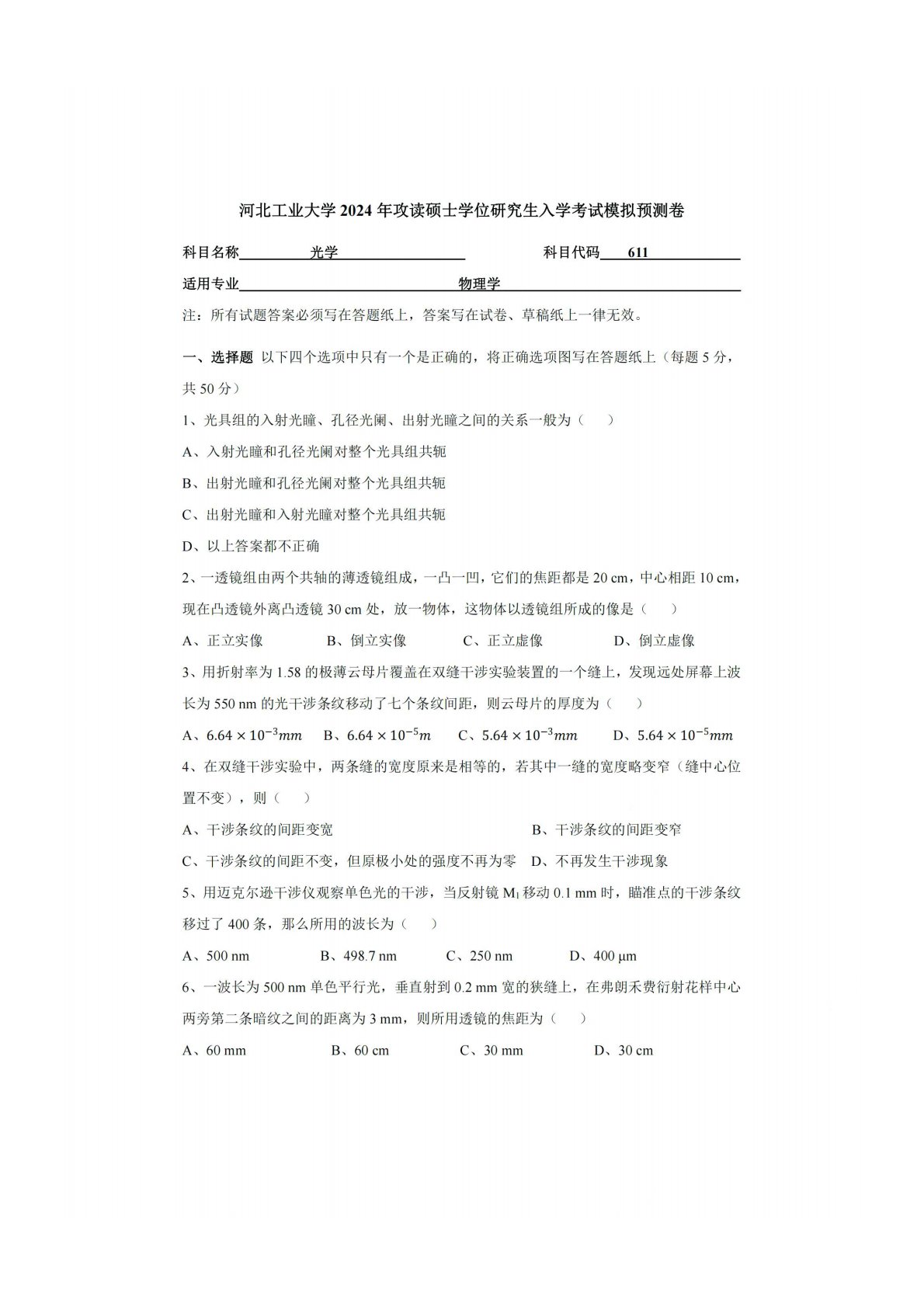 河北工业大学611光学2024年模拟题