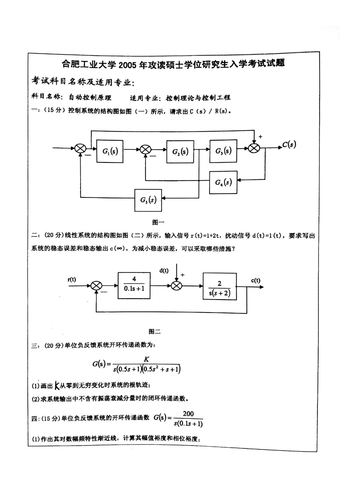 合肥工业大学834自动控制原理2005年考研真题