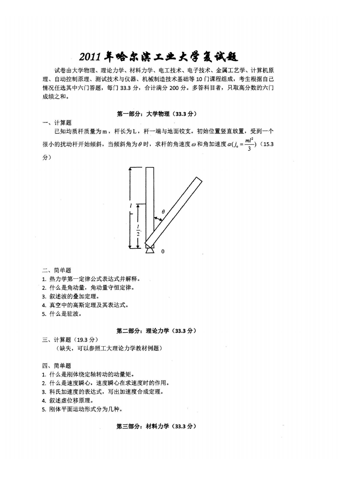 哈尔滨工业大学机械工程综合课2011年复试真题