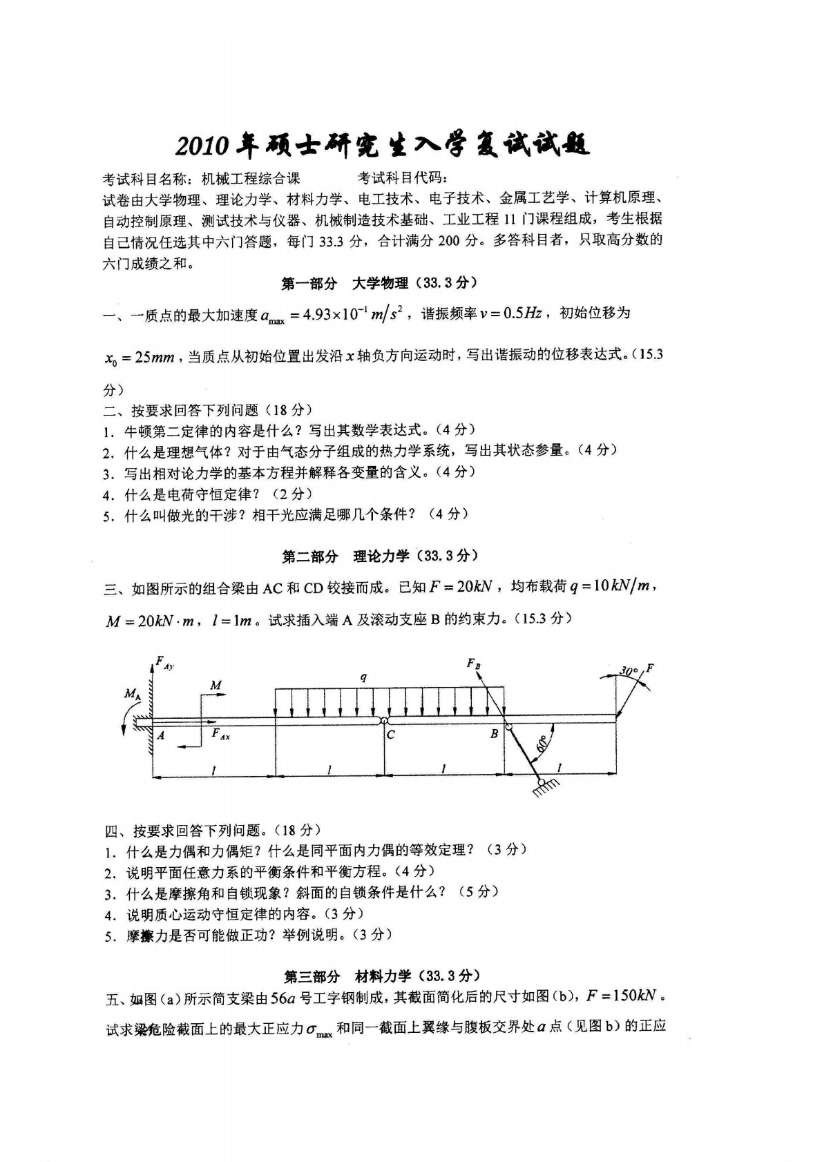 哈尔滨工业大学机械制造及其自动化2010年复试真题