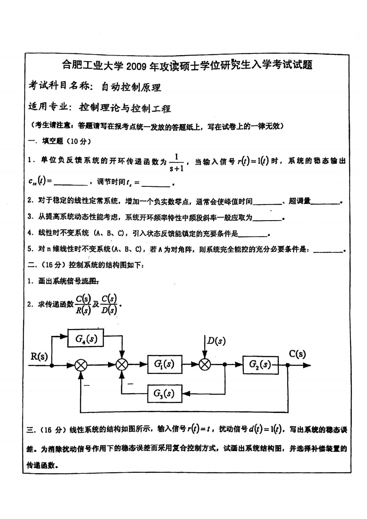 合肥工业大学834自动控制原理2009年考研真题