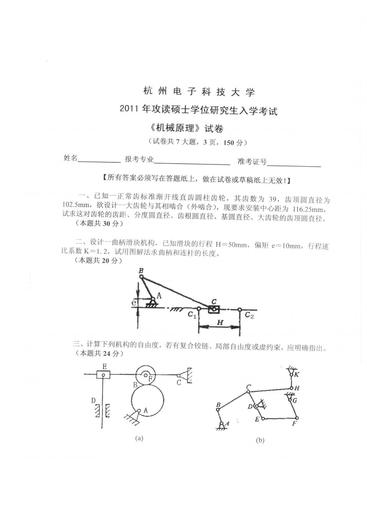 杭州电子科技大学2011年811机械原理真题