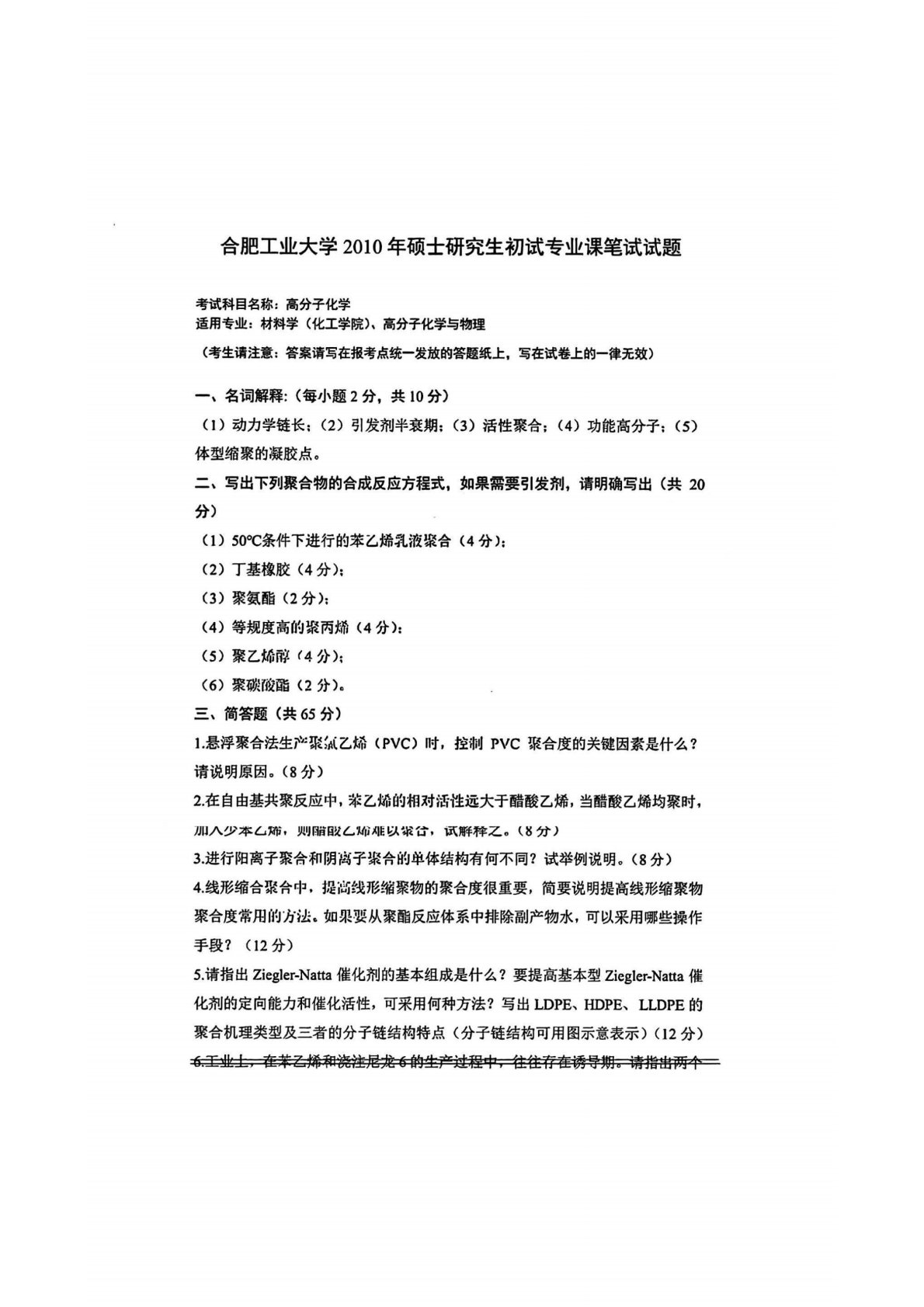 合肥工业大学809高分子化学2010年真题