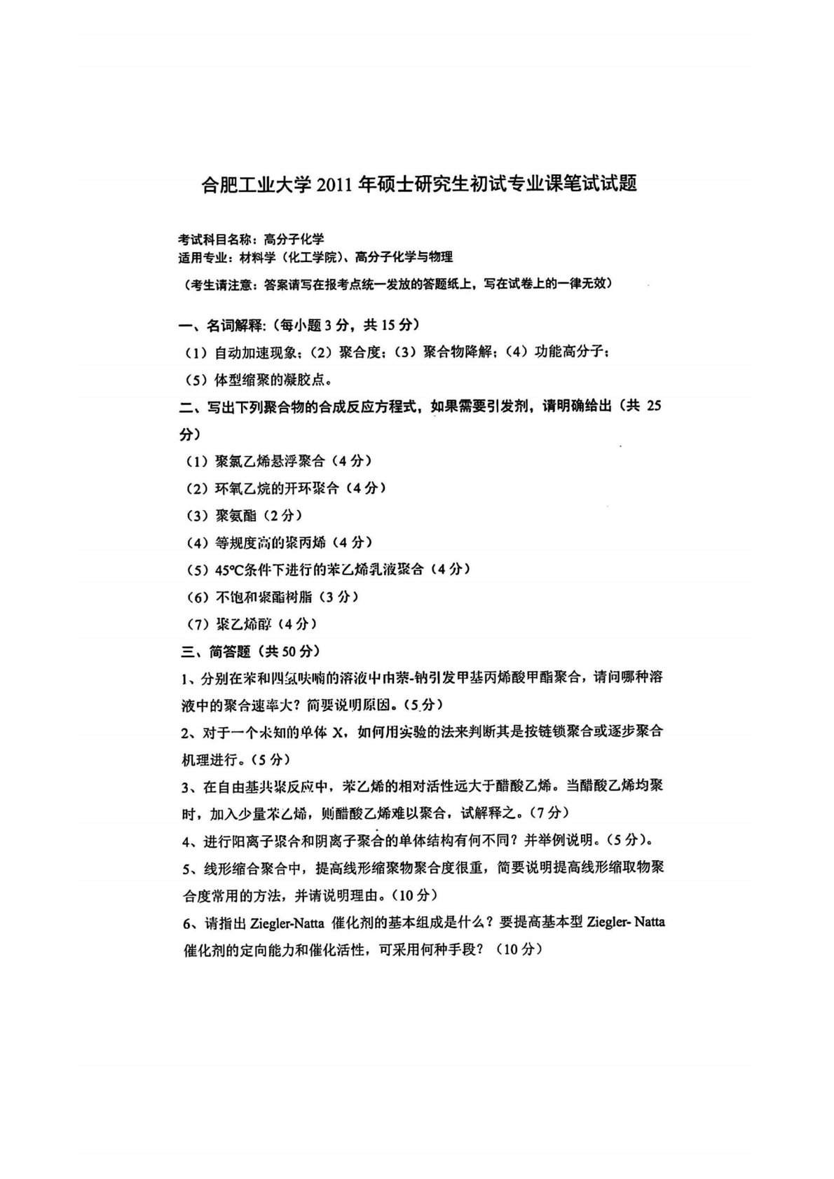 合肥工业大学809高分子化学2011年真题