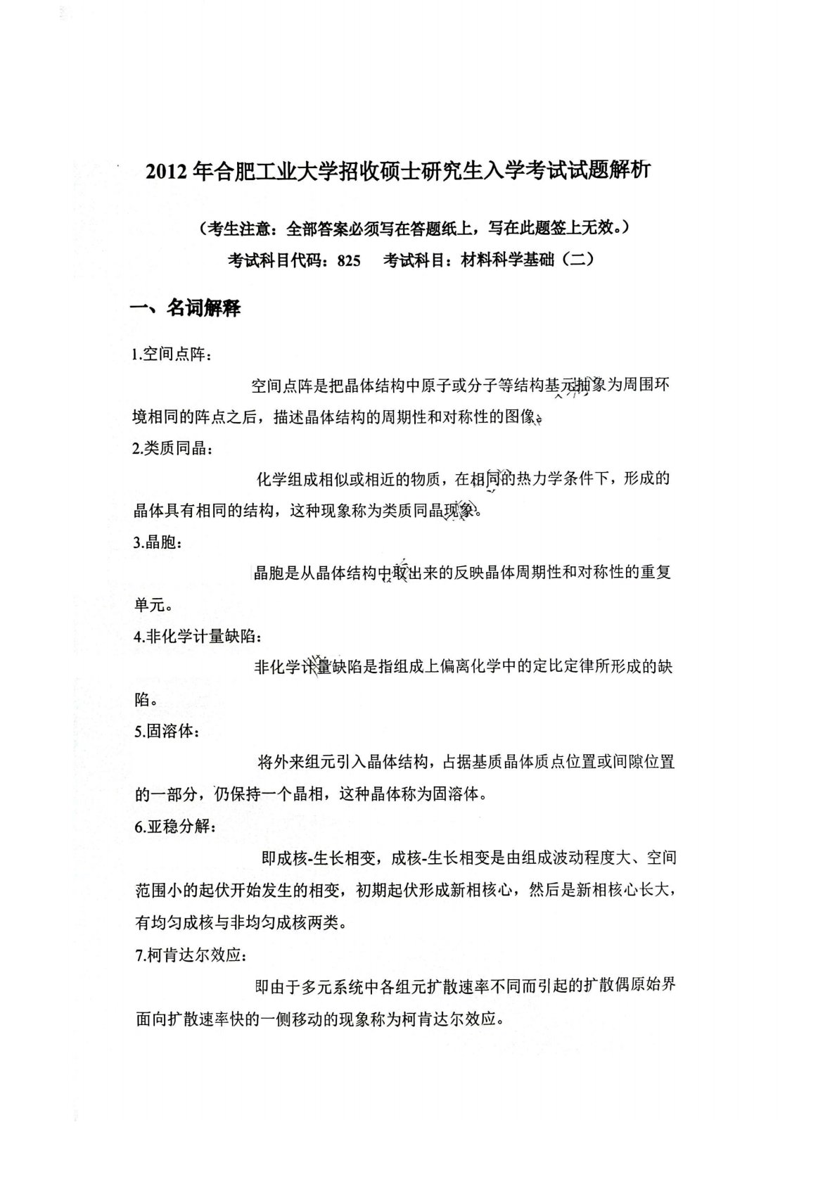 合肥工业大学815材料科学基础2012年真题答案