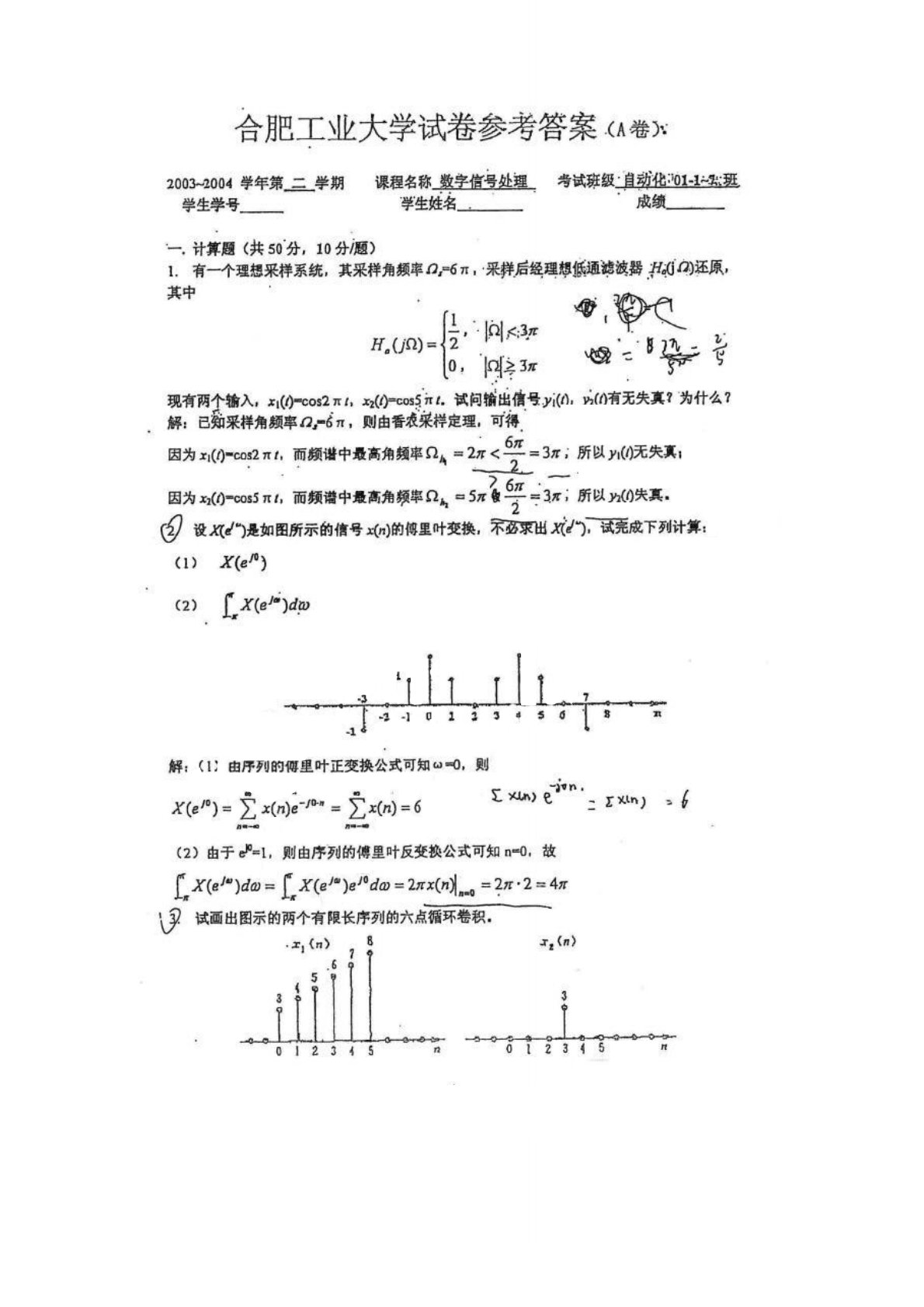 合肥工业大学833信号分析与处理综合2003-2004年期末题A答案解析