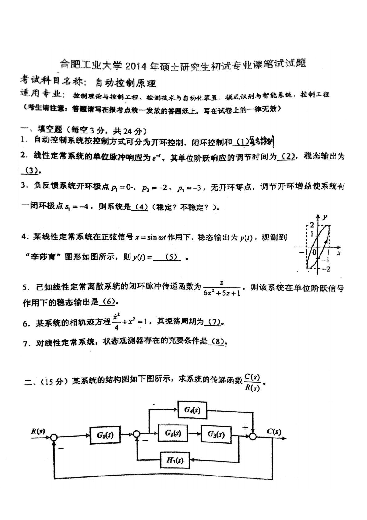 合肥工业大学834自动控制原理2014年考研真题