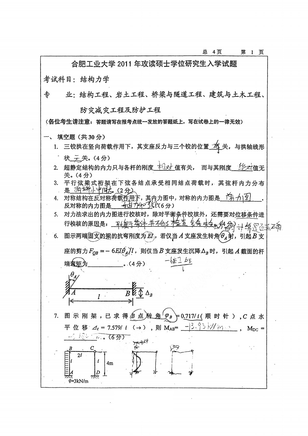 合肥工业大学2011年835结构力学考研真题