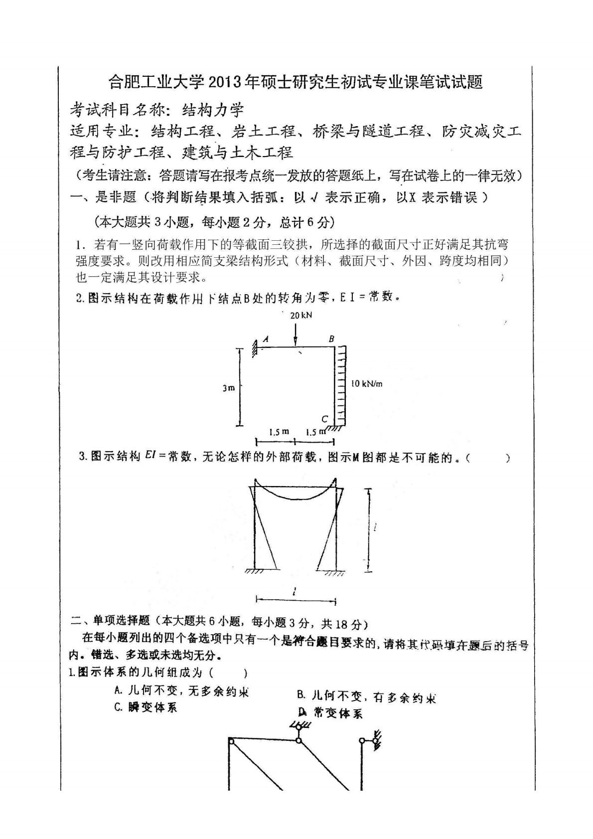 合肥工业大学2013年835结构力学考研真题