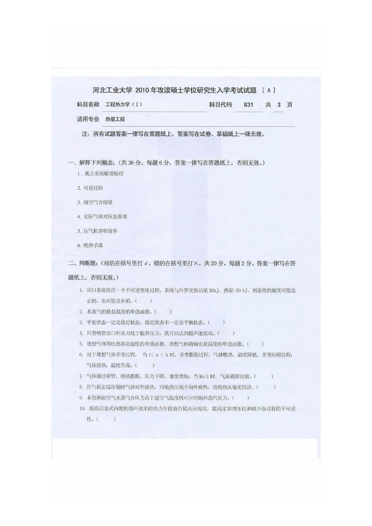 河北工业大学831工程热力学2010年真题I
