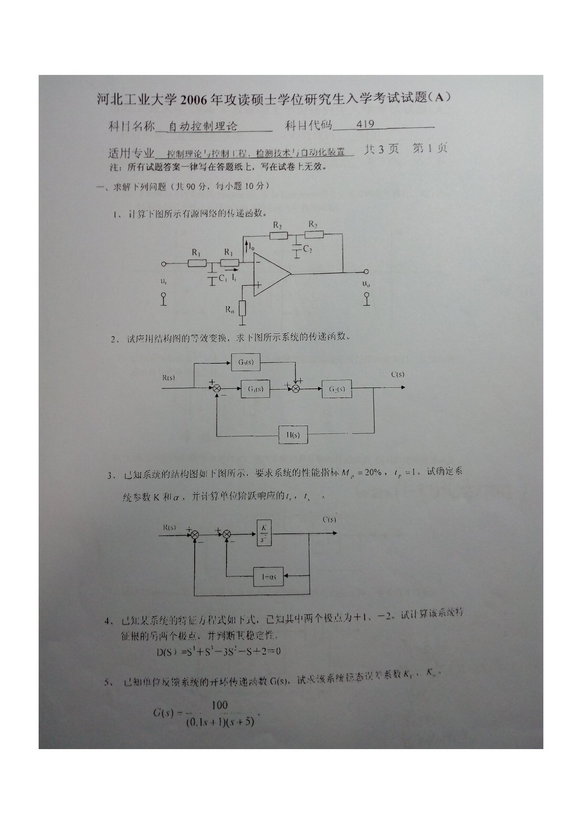河北工业大学980自动控制理论(含经典及现代控制理论)2006年考研真题