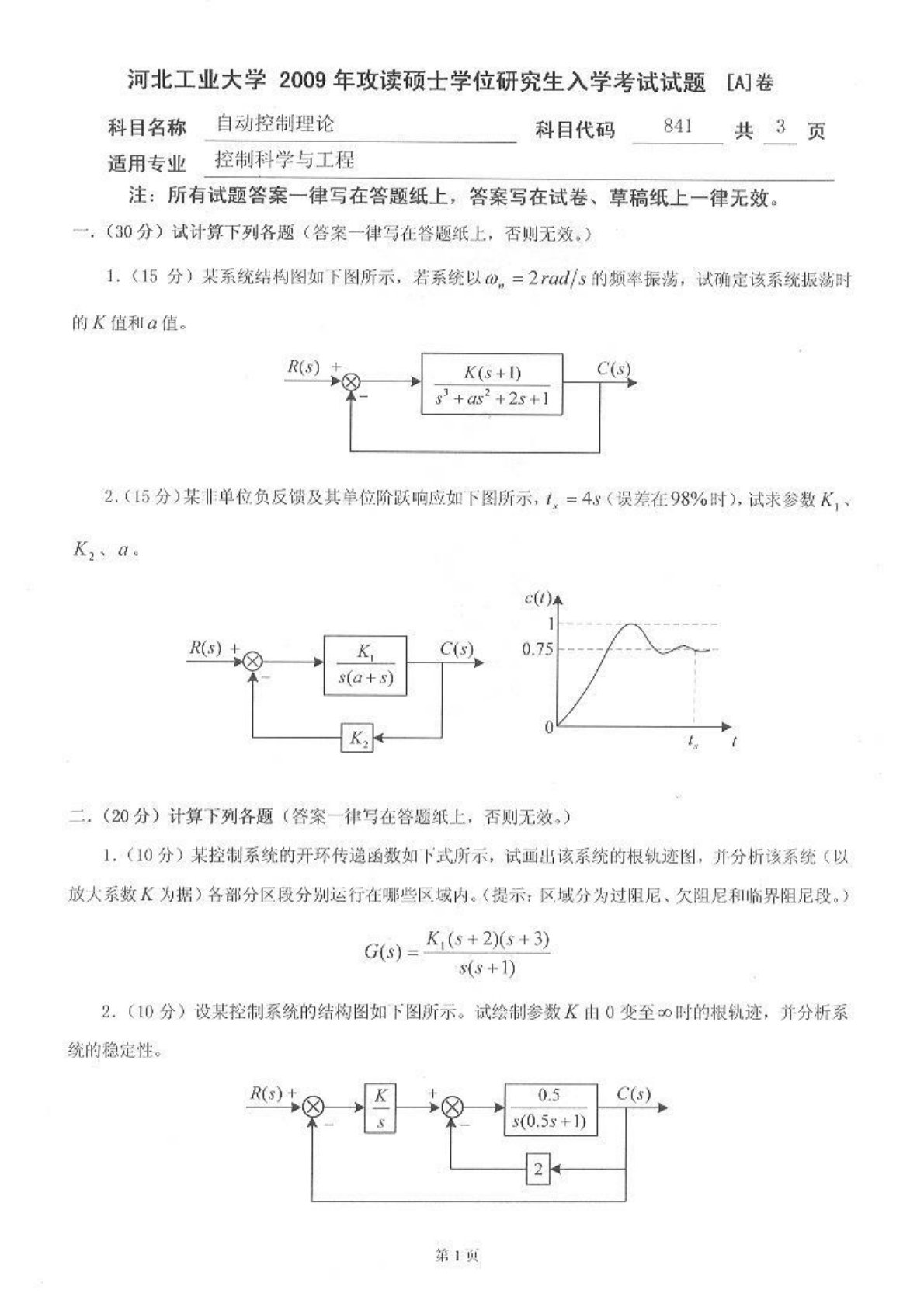河北工业大学980自动控制理论(含经典及现代控制理论)2009年考研真题