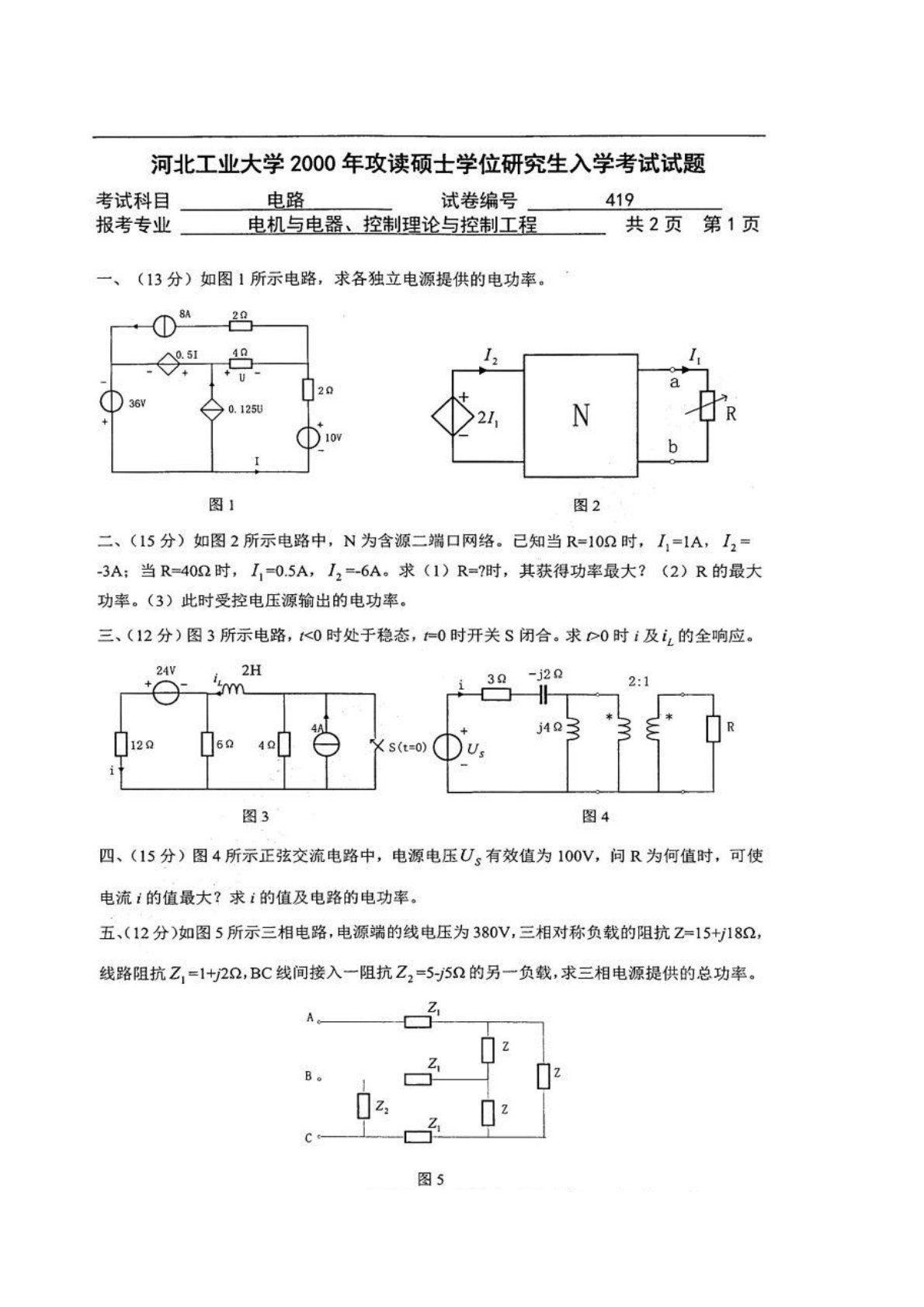 河北工业大学2000年840电工基础考研真题