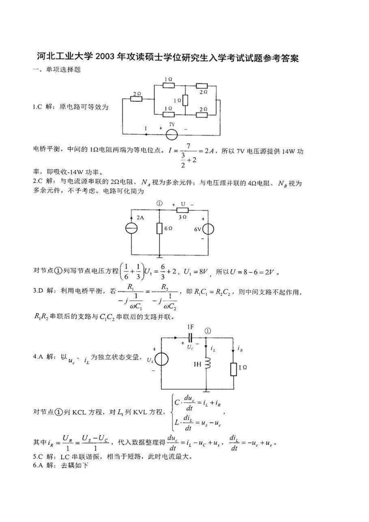 河北工业大学2003年840电工基础考研真题答案解析
