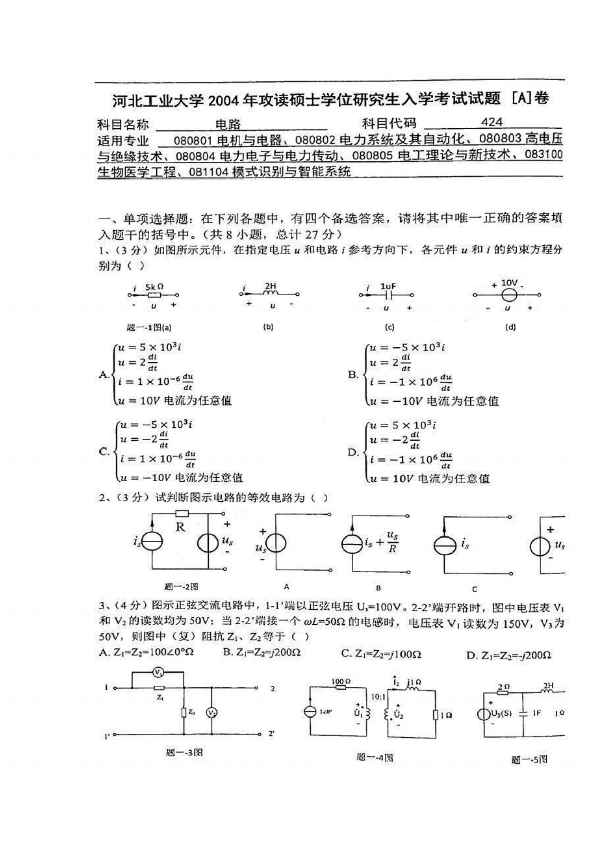 河北工业大学2004年840电工基础考研真题