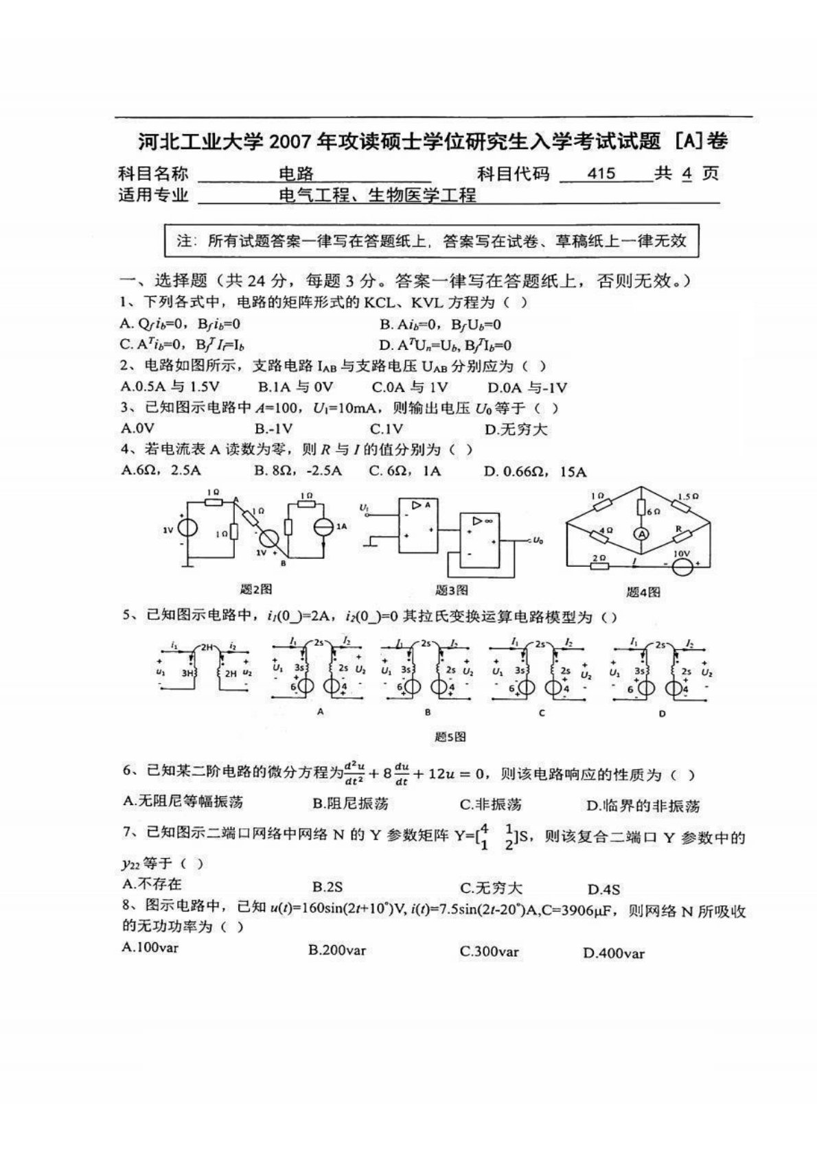清华大学827电路原理2008年真题