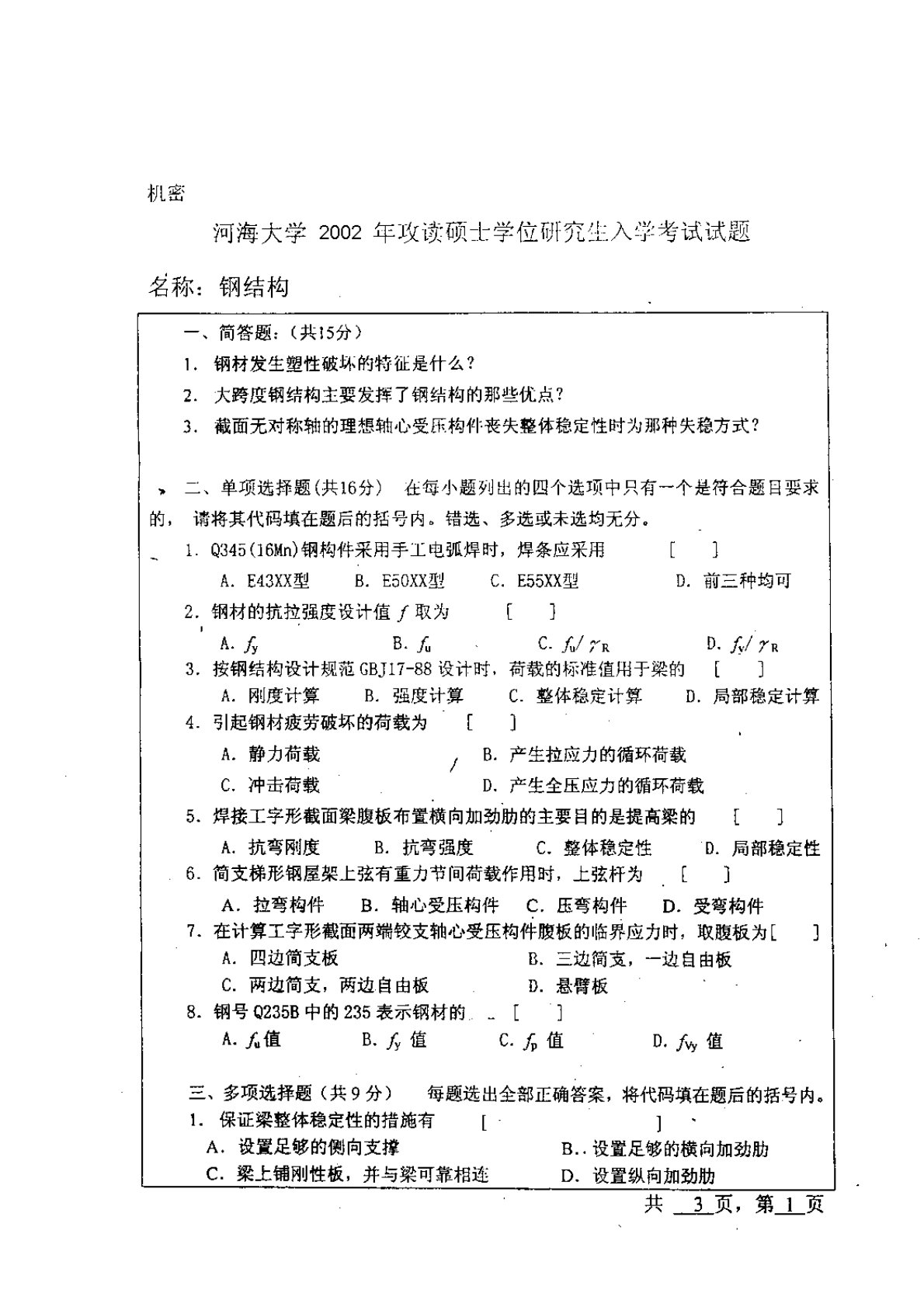 河海大学004002钢结构2002年真题
