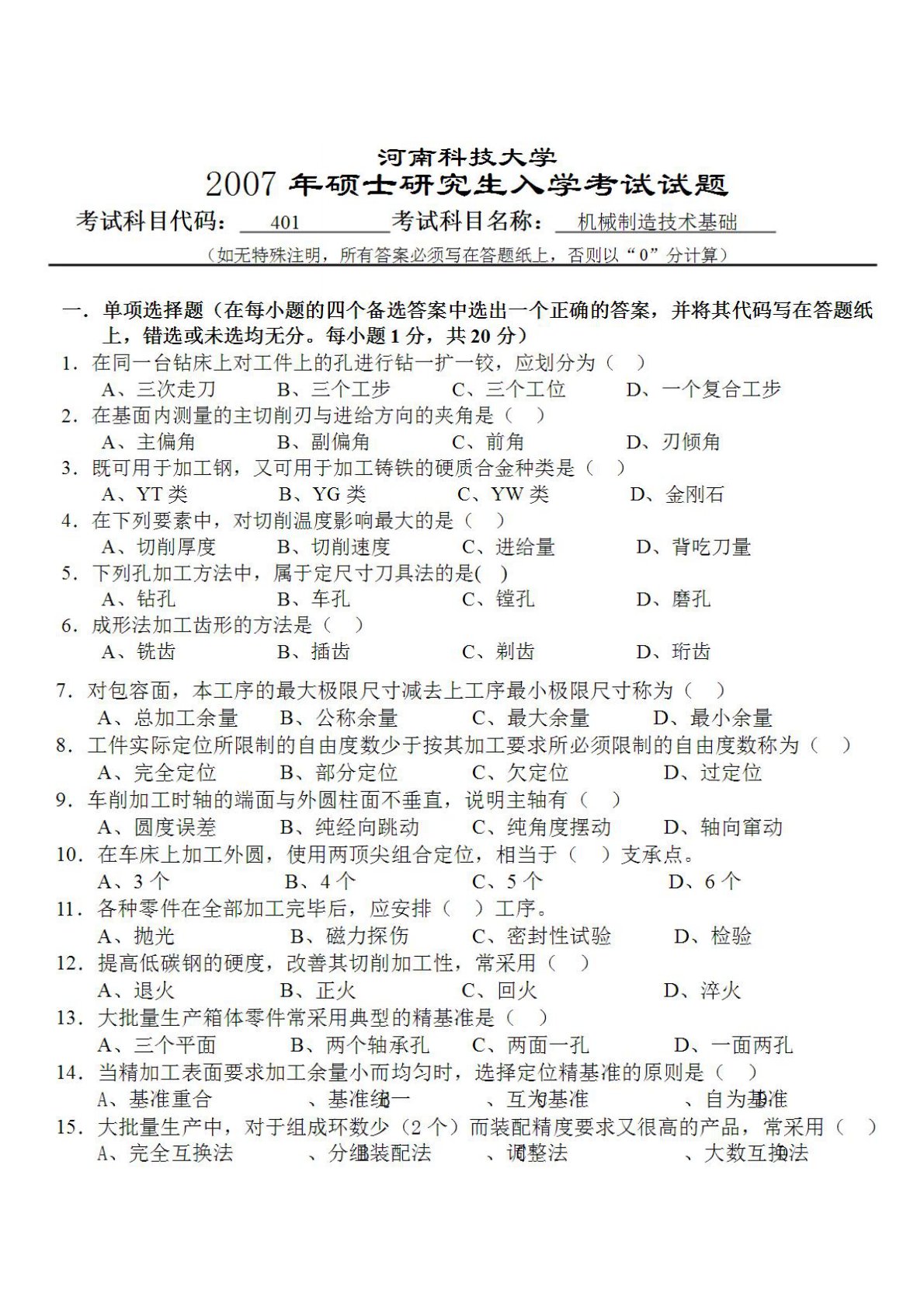 河南科技大学805机械制造技术基础2007年真题