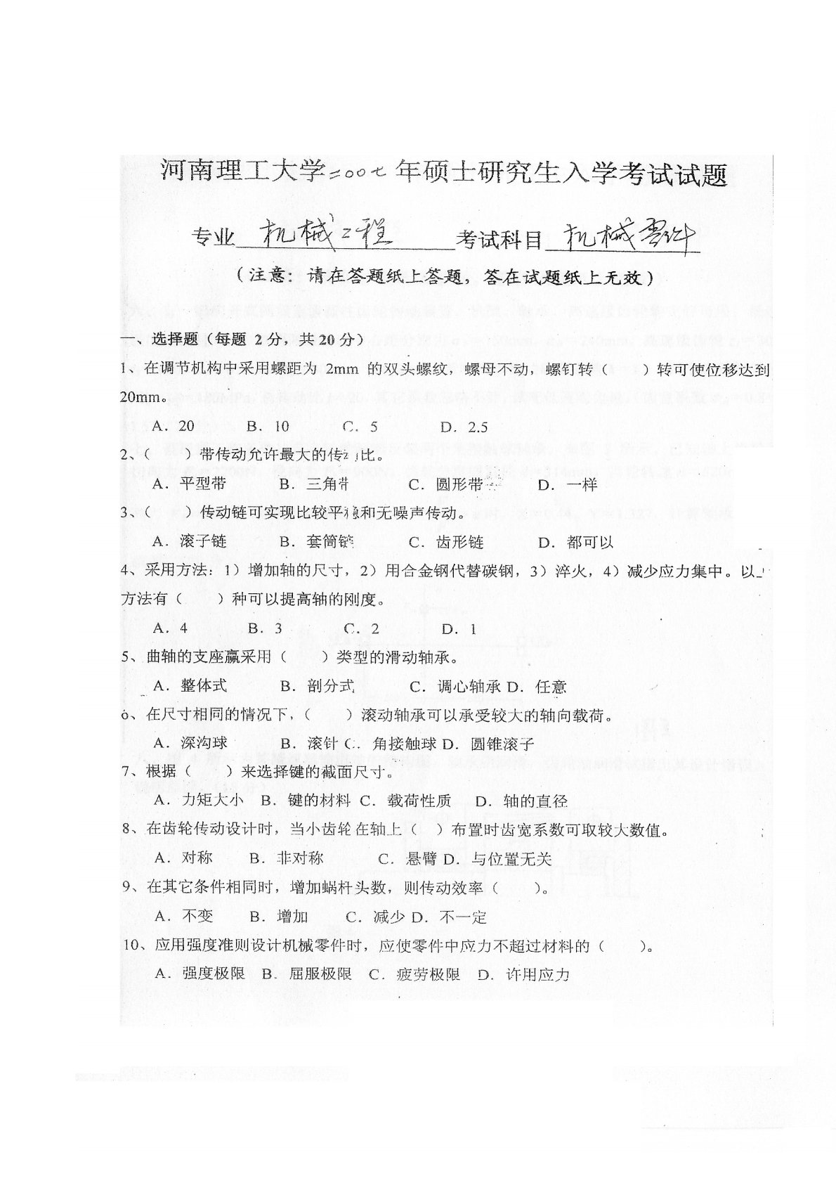 河南理工大学828机械设计基础2007年真题
